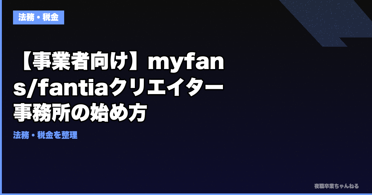 この記事を読めば、myfans/fantiaクリエイター事務所の収益モデル、法人設立、風営法の届出、クリエイターとの契約、運用フローがわかります。撮影・導線・法務・税務をまとめて支えるニーズはあるが、個人運用より一気に責任が重い。市場性だけで入ると危ない。