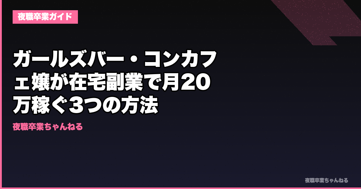 この記事を読めば、ガールズバー・コンカフェ嬢が在宅副業で月20万を目指す3つの方法、それぞれの特徴、自分に合う選び方がわかります。辞めたいけど収入は落としたくない人は、受け皿づくりから始めるのが現実的です。